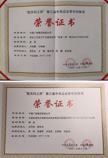 中廣核“自主三代百萬千瓦核電型號‘華龍一號’堆芯設計與安全分析”項目、“大型先進反應堆壓力容器無損檢測機器人”項目從68家央企申報的4209個項目中脫穎而出,分別榮獲本屆青年創新獎的金獎和銀獎。此外,中廣核還有8個項目榮獲優秀獎。
