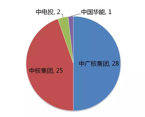 我國核電集團企業均由中央管理。我國從事核電建設與運營的集團主要有4個,分別為中核集團、中廣核集團、國家電投以及中國華能。截至2017年12月,我國商運核電機組按不同集團劃分,中核集團17個,中廣核集團20個;在建核電機組按不同集團劃分,中核集團8個,中廣核集團8個,國家電投2個,中國華能1個。2017年我國各核電集團公司核電機組數量如圖1所示。