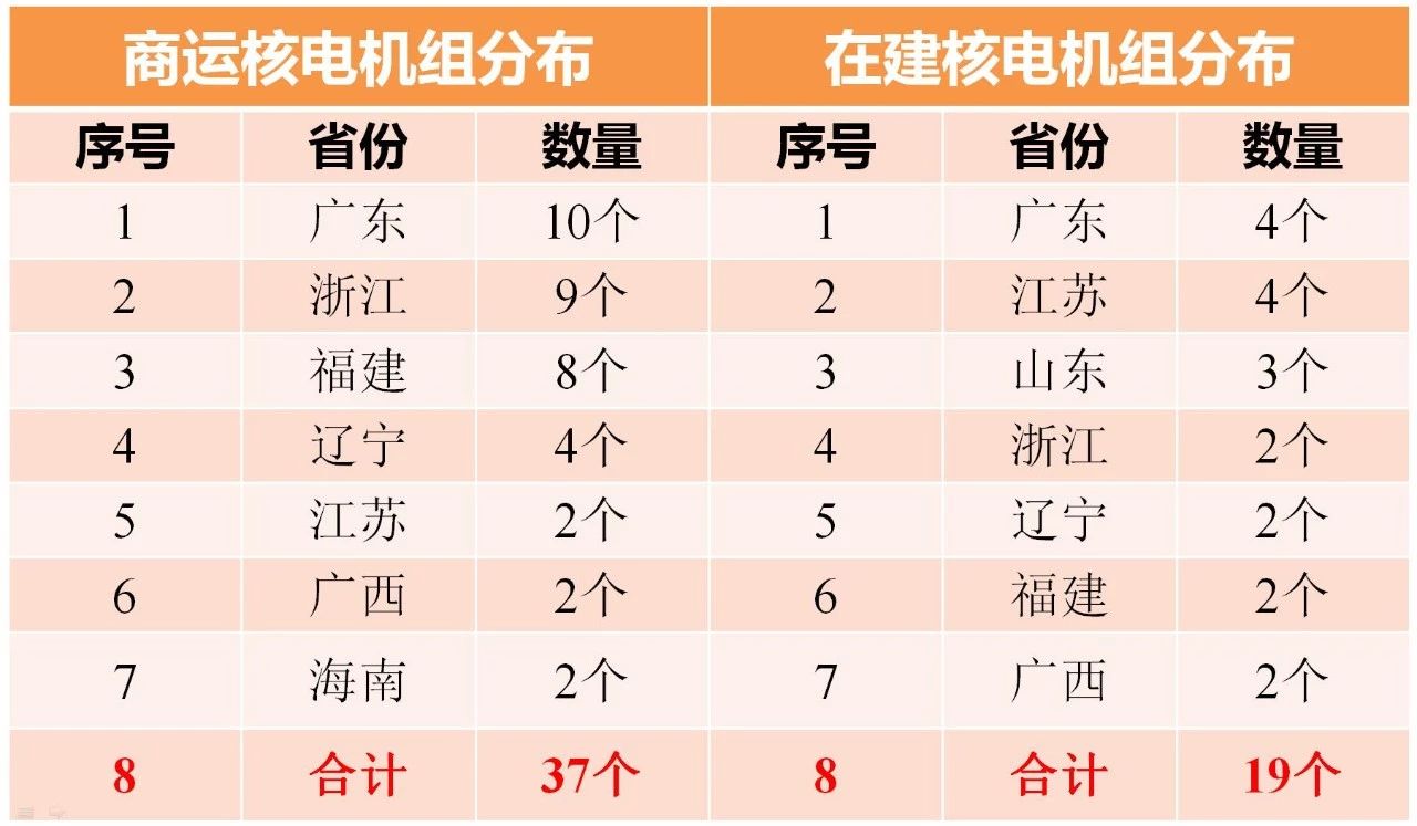 我國核電機組主要分布于東南沿海。截至2017年12月31日,我國商運核電機組分布在7個省,廣東省、浙江省與福建省數量最多,商運核電機組最多的市為浙江省嘉興市,機組數量為9臺;我國在建核電機組分布在7個省,廣東省、江蘇省與山東省數量最多。截至2017年12月我國核電廠分布情況如表1所示。