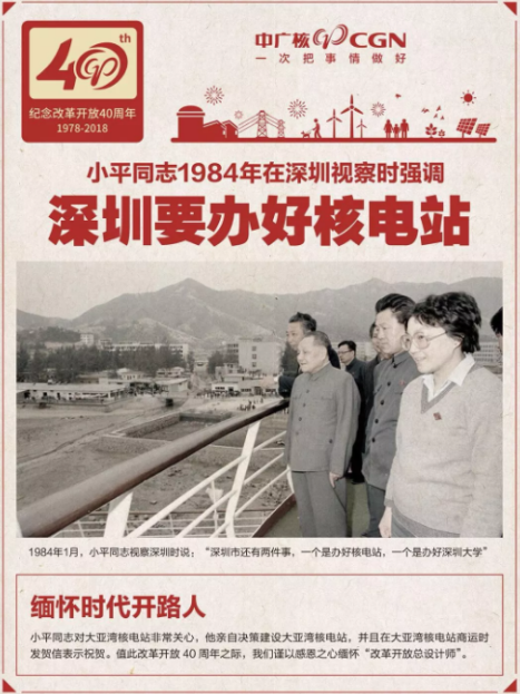 一句叮囑,將大亞灣核電站定位于深圳經濟特區能否辦成功的衡量標志之一;一份約定,道出了改革開放總設計師對大亞灣核電站建設成為“對外開放典范”的厚望;一個決策,力挽狂瀾,支撐著大亞灣核電站度過狂風暴雨,繼續揚帆前行;一聲祝賀,給披荊斬棘的大亞灣人巨大的鼓舞,讓他們奮勇前進。可以說,正是有了“改革開放總設計師”鄧小平的指引和堅定支持,才有了大亞灣核電站及我國商業核電的“高起點起步”,也才奠定了我國核電事業全面崛起的堅實基礎。