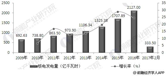 2008年以來,我國核電發電量逐年增長,近兩年的增速有所提高。2015年,我國核電發電量達1707.89億千瓦時,同比增長28.86%;2016年,我國核電發電量為2127.00億千瓦時,同比增長24.54%,達到歷年新高;截至2月份,2017年的核電發電量達到333.50億千瓦時。