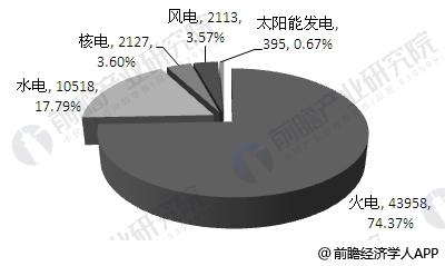 就發電結構來看,2016年,水電發電量10518億千瓦時,占全國發電量的17.8%;火電發電量43958億千瓦時,占全國發電量的74.37%;核電、風電和太陽能發電量分別為2127億千瓦時、2113億千瓦時和395億千瓦時,比重分別為3.60%、3.57%和0.67%。