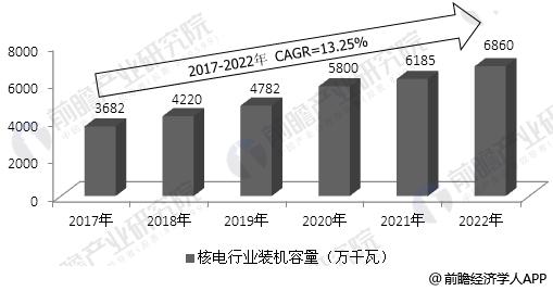 根據《核電中長期發展規劃(2011-2020年)》以及核電十三五規劃,前瞻產業研究院預判到2022年我國核電總體裝機容量將超過6800萬千瓦,在建裝機容量超過3000萬千瓦,2017-2022年均復合增長率在為13.25%,核電產業發展空間巨大。