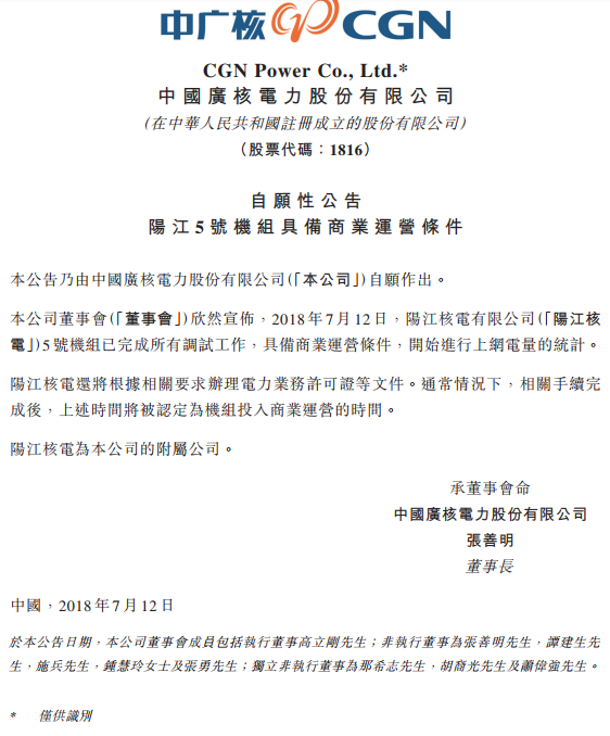 中廣核電力公告,2018年7月12日,公司的附屬公司陽江核電有限公司5號機組已完成所有調試工作,具備商業運營條件,開始進行上網電量的統計。