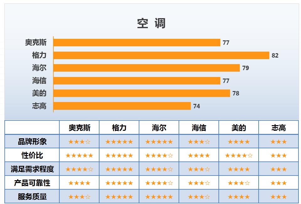 報告顯示,在空調行業6個主要品牌的調查中,格力綜合得分為82分,排名第一,是唯一一個80分以上的品牌;具體到各指標中,格力在品牌形象、性價比、滿足需求程度、產品可靠性、服務質量五大主要維度上,表現都十分突出,是唯一全部獲得“滿五星”的品牌。
