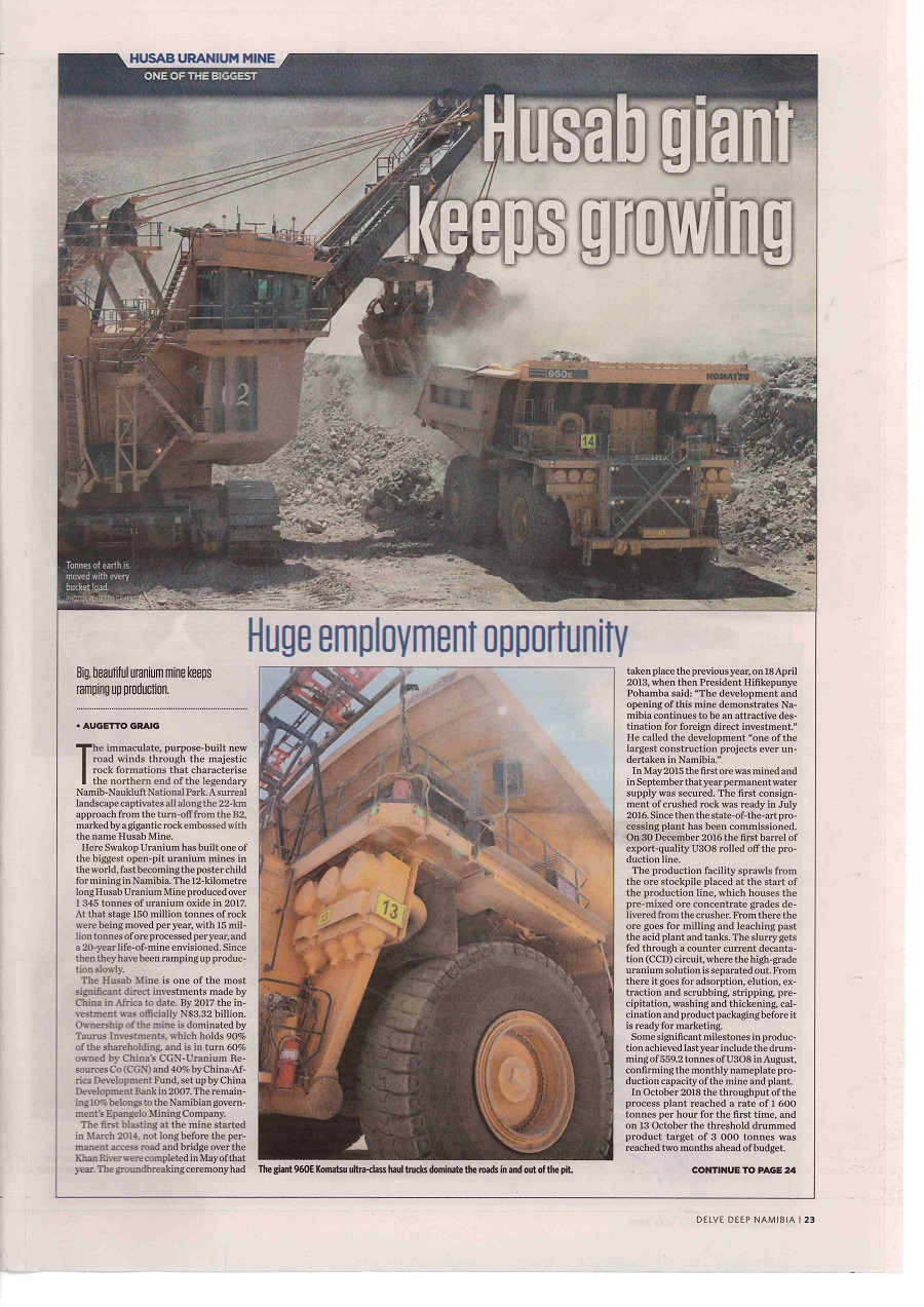湖山鈾礦作為納米比亞最大的礦業企業,長期以來受到了納米比亞乃至非洲南部媒體的高度關注。日前,納米比亞四大日報之一、納米比亞發行量最大的南非荷蘭語報紙《the Republikein》三個整版報道題為《Husab giant keeps growing Huge employment opportunity 》的文章,對中廣核下屬斯科公司良好經營納米比亞湖山鈾礦,提振納米比亞礦業就業給予積極評價。