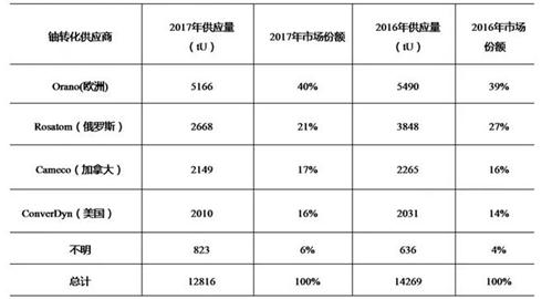 2016-2017年歐洲核電機組的鈾轉化服務供應情況