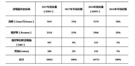 國際市場主要有三家鈾濃縮服務供應商:俄羅斯國家原子能集團公司(Rosatom)、歐洲鈾濃縮公司(Urenco)、法國歐安諾集團(Orano)。據WNA統計,2017年國際主要鈾濃縮供應商生產能力共計約5.5萬噸,全球分離功總需求約為5萬噸SWU(含我國)。國際鈾濃縮市場還存在一定的二次供應,2013~2018年,國際市場平均每年鈾濃縮二次供應量約為9000tSWU。