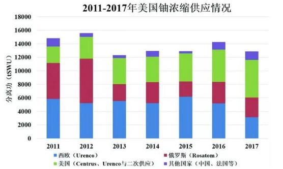 自2011年以來,美國分別從德國、荷蘭、俄羅斯、英國、法國、中國等多個國家采購分離功,其中主要進口國是西歐與俄羅斯。俄羅斯2011、2012年在美國市場的占比分別為36%、42%。此后,基于美國對俄羅斯鈾濃縮服務的由于配額限制,進口比例在20%上下,約為3000tSWU。