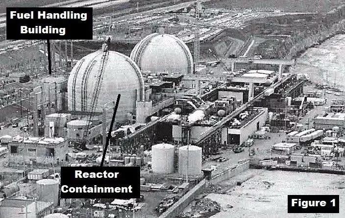 圖1是1980年圣奧諾弗雷2號和3號機組建造期間的鳥瞰圖。反應堆堆芯位于反應堆安全殼圓頂內,堅固的結構由厚鋼筋混凝土制成。每臺機組都有一個乏燃料池,位于自己的燃料處理大樓內,這是一個工業級結構設計,在風吹或地震時不易倒塌。