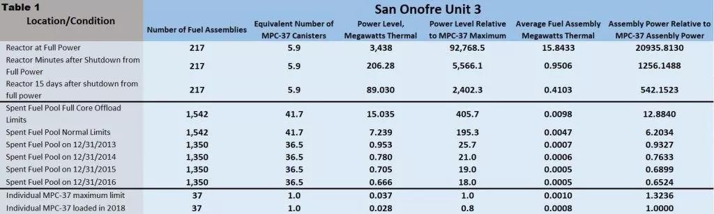 表1第三欄提供了反應堆堆芯和乏燃料池中燃料組件的清單,以等效MPC-37罐的數量表示。從一個反應堆堆芯取出燃料組件大約需要6個MPC-37容器。在目前的裝載活動開始之前,從3號機組乏燃料池中取出燃料組件需要36個MPC-37罐。因此,乏燃料池包含大約六個反應堆堆芯等價燃料組件,而反應堆堆芯包含大約六個MPC-37等價燃料組件。