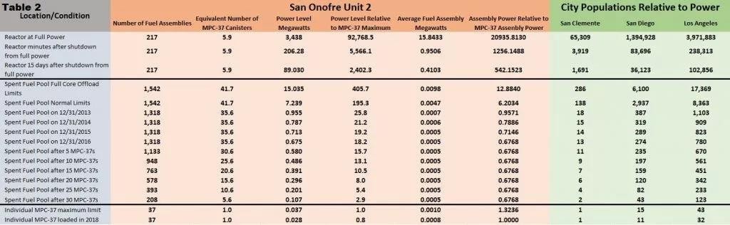 為有助于將燃料組件的相對功率數據放到上下文中,表2中提供了另外三列。該列將附近三個城市人口聯系到相對于MPC-37最大功率水平(即:列5數據)的功率水平。當反應堆關閉時,功率水平下降,燃料被卸載到乏燃料池,燃料被轉移到干式貯存,人口數量減少了同樣的百分比。