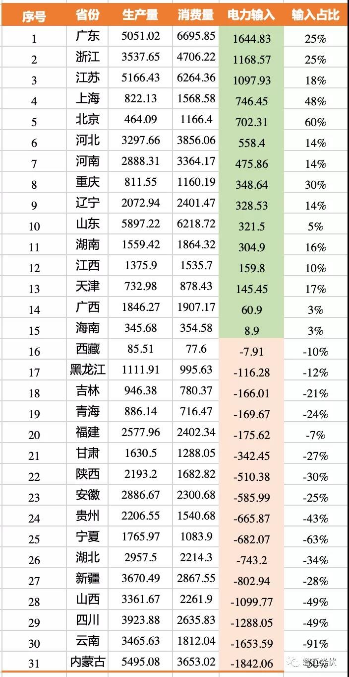 2019年,廣東、江蘇、山東省用電量位居前三,山東、內(nèi)蒙古、江蘇發(fā)電量位居前三;廣東、浙江、江蘇區(qū)外受電量位居前三,北京、上海、重慶區(qū)外受電占用電量的比重位居前三。表:2019年各省電力的生產(chǎn)、消費量(單位:億kWh)。