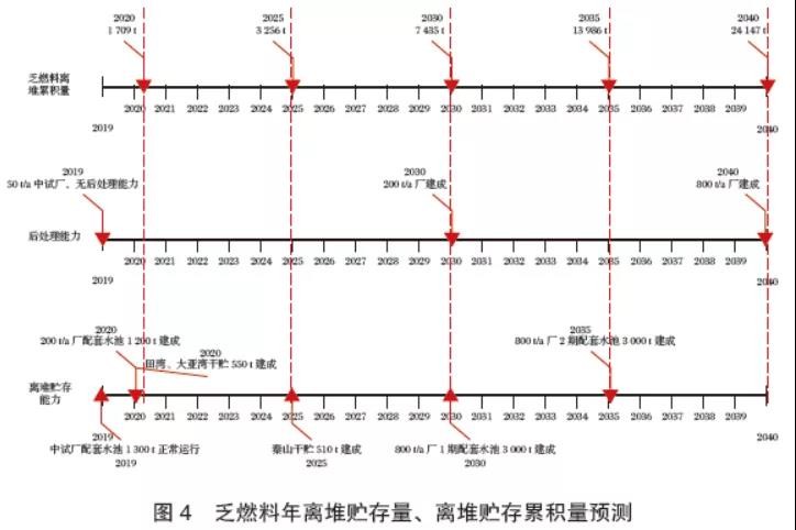 假設在運的后處理中試廠及配套水池正常運行,在建的田灣、大亞灣、秦山核電站的干法貯存設施,后處理示范廠、800t/a后處理廠的配套水池均按計劃建成投運,后處理示范廠、800t/a后處理廠均比規劃的時間節點推遲5年建成投運,結合乏燃料在堆冷卻滿10年后離堆貯存測算條件下的乏燃料離堆貯存累積量,對乏燃料離堆貯存實際需求進行預測。