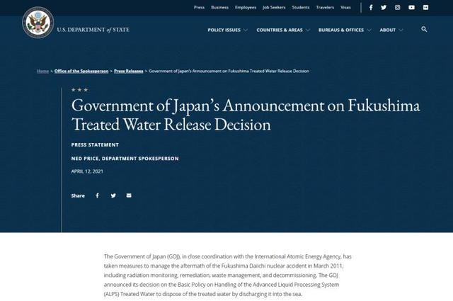 美國務院在日本政府正式宣布上述決定之后,在官網發布聲明稱,“日本政府與國際原子能機構(IAEA)密切合作,已采取措施對2011年3月福島第一核電站核事故的后果進行處理。日本政府已宣布關于ALPS(多核素去除設備)處理水的基本政策的決定,將處理后的核污水排入大海。”