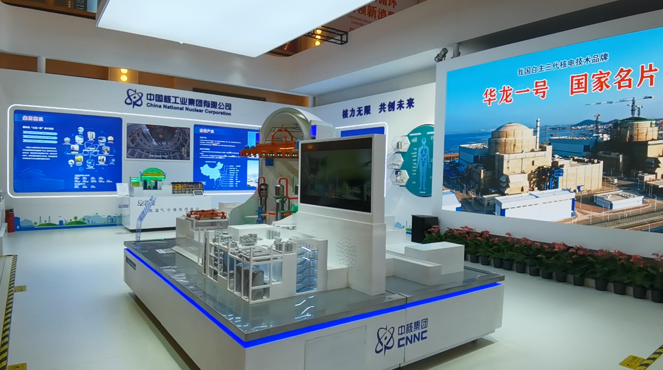 中核集團展廳位于上海展覽中心中央大廳C位。整個展陳以影像視頻、全息模型以及圖文等手段,集中展示集團公司在核能領域一系列自主創新科技成果,重磅推介華龍一號、高溫氣冷堆以及核安保、核醫療等最新產品,充分彰顯了集團公司為促進經濟發展、帶動科技自主創新、服務民生保障、推動中國制造走向世界進程中的大國企業品牌力量。