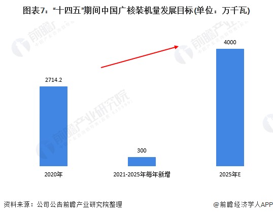 根據(jù)《十四五規(guī)劃和2035年愿景目標綱要》,“十四五”期間,我國核電運行裝機容量達到7000萬千瓦。中國廣核作為我國核電行業(yè)的龍頭企業(yè),也提出了其十四五發(fā)展目標:“十四五”期間,中國廣核將保持每年300萬千瓦以上發(fā)展速度,預計到“十四五”末,中廣核境內(nèi)新能源在運裝機總?cè)萘繉⑼黄?000萬千瓦。