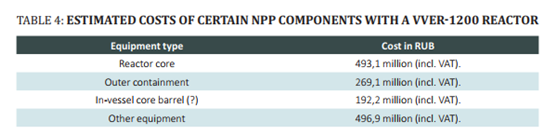 Rosatom的負責人Alexey Likhachev在之前與總統普京的會晤中表示:“俄羅斯在國外核電建設的隊伍相比其它國家是最多的。”在2020年,Rosatom表示,新冠疫情對其國外項目的影響很小。 在過去的十年中,Rosatom以巨額貸款的形式向其他國家出口核電,以推廣俄羅斯的核電技術。增加俄羅斯核電技術在國際市場的份額是Rosatom的四個主要戰略目標之一。截至2020年末,Rosatom已在國外12個國家有35座反應堆在建或完工。 Rosatom目前在向國外潛在客戶推介VVER-1200機型。VVER-1200原本被稱為AES- 2006,是俄羅斯主力機型VVER-1000的升級版。第一臺VVER-1200在國內的Novovoronezh-2 核電站建造,并于2017年2月全面投入商業運行。 Rosatom一般不公布單堆造價,但是Interfax于2017年發布的在Ostrovets核電站建造的VVER-1200機組預計成本提供了逐項成本的一些參考,如下面的表4所示。(1盧布=0.087元人民幣)