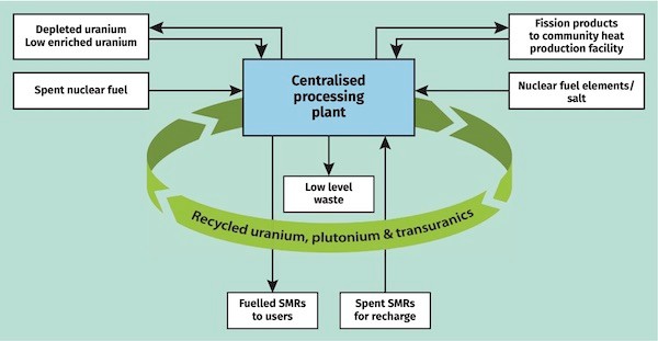 中心和衛星概念允許通過復制和大規模制造來節省成本,而廢物管理的集中化意味著回收燃料和處置廢物的復雜操作的成本可以分攤到大量反應堆上。