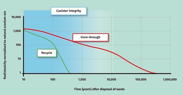 核過程中不可還原的廢物(主要是裂變產物而不是次要的錒系元素)只是乏燃料的一小部分,而這一部分也是產生大部分麻煩的熱量的原因。當使用結束時,裂變產物部分本身可以被允許留在原處而無需進一步的人工干預。這是因為在物理遏制(例如罐)失效之前,危害將衰減到基本無害的水平。如果分離出發熱部分,則可能會使用熱量。
