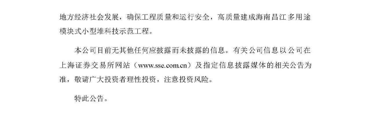 海南昌江多用途模塊式小型堆科技示范工程項(xiàng)目由該公司全資子公司中核海南核電有限公司作為項(xiàng)目業(yè)主,采用該公司控股股東中核集團(tuán)的“玲龍一 號”小型堆核電機(jī)組技術(shù),單臺機(jī)組容量為125MW。