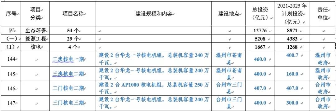浙江省發改委日前印發《浙江省重大建設項目“十四五”規劃項目表》。其中包括能源工程類核電項目4個,總投資1667億元,2021-2025年計劃投資1268億元,涉及三澳核電一期、三澳核電二期、三門核電二期、三門核電三期。