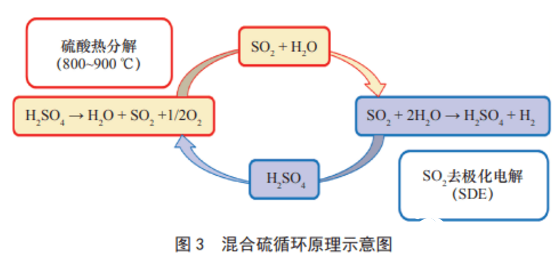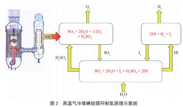 熱化學制氫是將核反應堆與熱化學循環制氫裝置耦合,以核反應堆提供的高溫作為熱源,使水在800℃至1000℃下催化熱分解,從而制取氫和氧。目前,國際上公認最具應用前景的催化熱分解方式是由美國開發的硫碘循環,其中的硫循環從水中分離出氧氣,碘循環分離出氫氣。