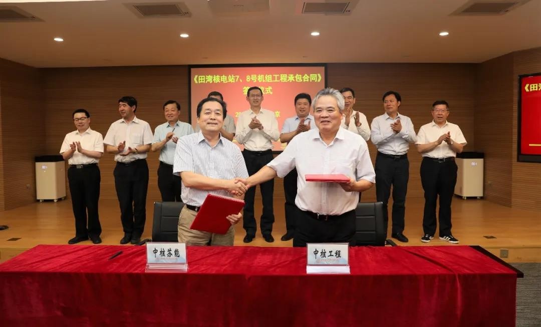 最后,陳勁主持田灣核電站7、8號機組和徐大堡核電廠3、4號機組工程承包合同簽字儀式,徐鵬飛代表中核工程分別與中核蘇能黨委書記、董事長劉兆華和遼寧核電黨委書記、董事長王秀啟簽署《田灣核電站7、8號機組工程承包合同》和《徐大堡核電廠3、4號機組工程承包合同》。