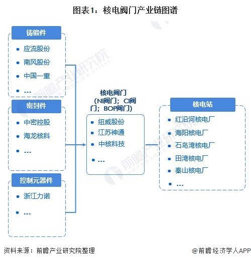 核電閥門產業鏈上游為鑄鍛件、密封件、控制元器件等;中游核電閥門分為核島NI閥門、常規島CI閥門和輔助BOP閥門三部分,代表企業為鈕威股份、江蘇神通、中核科技;下游為各核電站。具體產業鏈圖譜如下所示: