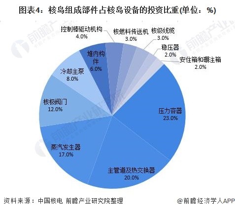 據中國核電和中國核電信息網的披露,一般而言,核島設備中,壓力容器、主管道及熱交換器、蒸汽發生器都是投資的重點,其中壓力容器占比為23%,主管道及熱交換器占比為20%,蒸汽發生器占比為17%,核島閥門占核島設備投資中的比例大概為12%。