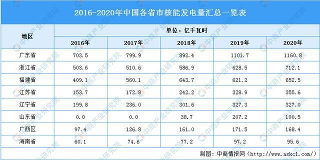 數據顯示,2020年我國核能發電量3662.5億千瓦時。2020年中國核能發電量集中在廣東省、浙江省、福建省、江蘇省、遼寧省、山東省、廣西區、海南省。其中,2020年廣東省核能發電量排名第一,累計產量為1160.8億千瓦時。