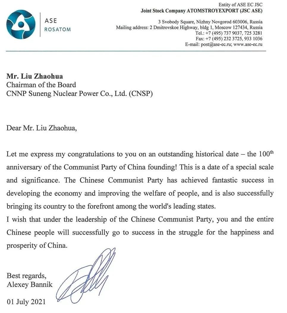 在中國共產(chǎn)黨成立100周年之際,中國核電旗下田灣核電、遼寧核電收到了來自俄羅斯原子能建設(shè)出口有限公司發(fā)來的賀信,對中國共產(chǎn)黨成立100周年表示祝賀。