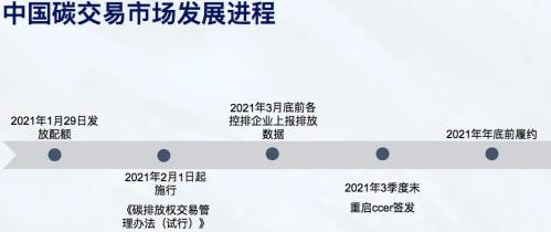 具體日程安排如下:2021年1月29日發放配額;2月1日起實施《碳排放權交易管理辦法(試行)》;3月底前各控排企業上報排放數據;今年3季度末重啟中國核證自愿減排量(CCER)簽發;2021年年底前履約。