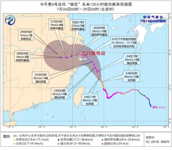 2021年第6號臺風“煙花”(7月24日6:00)位于三門核電現場東南方向約460km,中心風力14級以上(40m/s),7級風圈半徑300km。三門核電現場預計7月24日17點進入七級風圈,臺風預計25日18點登陸臺州灣附近海域。該臺風強度強、水汽充沛,是今年首個嚴重影響浙江省的臺風。