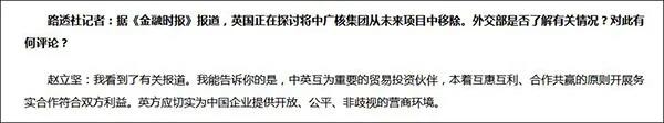 路透社記者提問:據《金融時報》報道,英國正在探討將中廣核集團從未來項目中移除。外交部是否了解有關情況?對此有何評論?