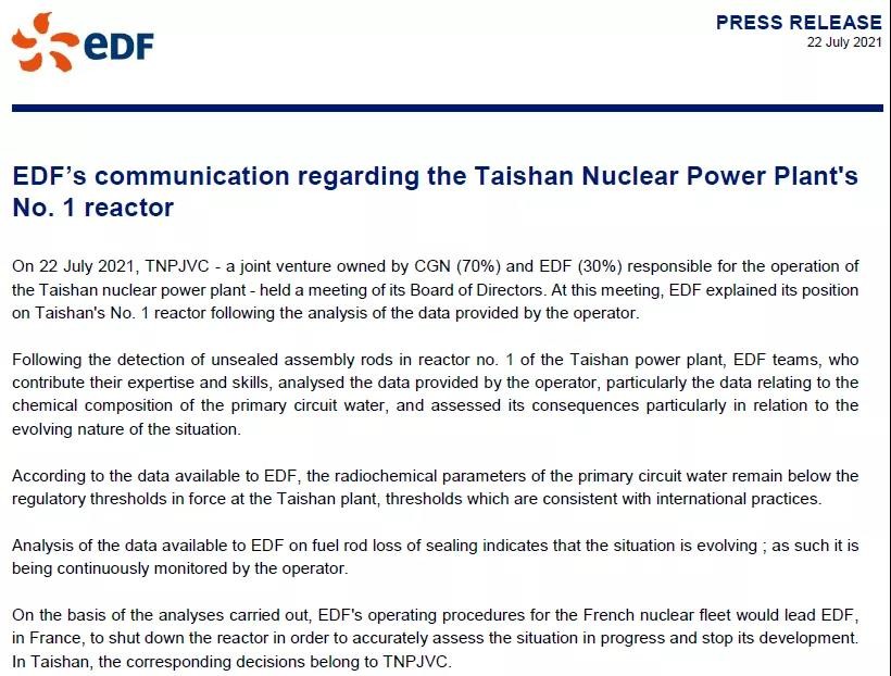 7月23日,臺(tái)山核電的法方股東EDF突然發(fā)表了一份聲明,大概意思就是燃料破損這事要是放在俺們法國(guó),就停堆檢修了,但是中國(guó)這邊停不停,還是看中國(guó)這邊的意見(jiàn)。