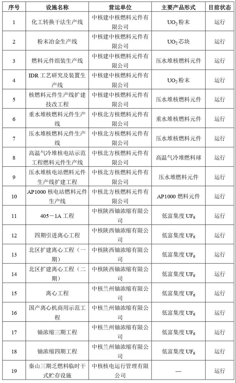 表1 我國主要的民用核燃料生產、加工、貯存設施