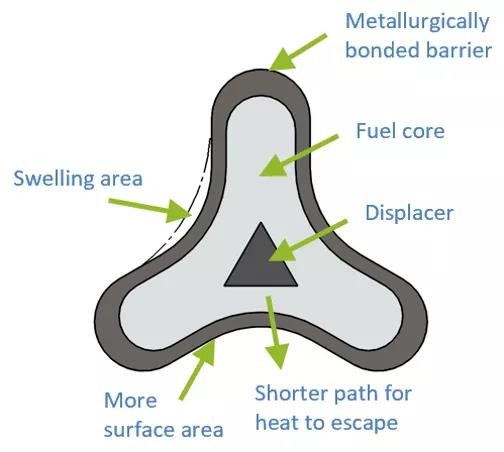 燃料棒的形狀不同于任何其他商用核燃料技術(shù)。這種燃料棒是扭曲的,不需要復(fù)雜的燃料組件間隔棒和混合網(wǎng)格,因?yàn)槿剂习羰潜旧碜匀淮嬖诟魱牛⑻峁┕潭ǖ幕旌侠鋮s劑。