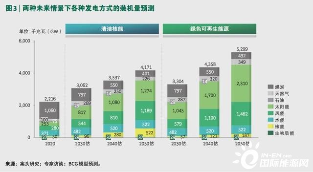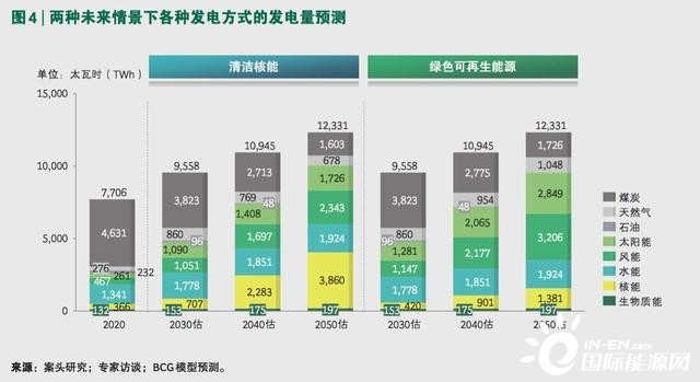 該報告的主要作者,BCG董事總經理、全球合伙人、能源專項中國區聯席負責人周涵在接受澎湃新聞采訪時表示,團隊在報告中設計了兩種情景——清潔核能和綠色可再生能源情景,對中國未來電力能源結構進行展望。其中,清潔核能情景假設積極發展核電,綠色可再生能源情景假設重點發展可再生能源。