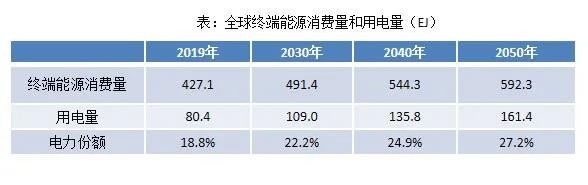 從下表中可以看出,從2019年到2050年全球用電量雖然逐年上升,但在終端能源消費(fèi)總量中最高為27.2%,其它均為非電力消費(fèi)。