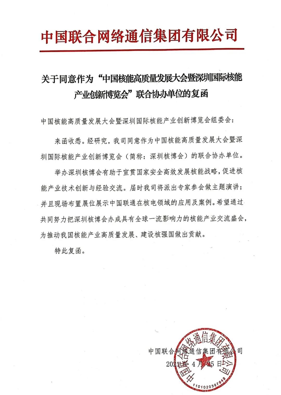 旨在宣貫國(guó)家安全高效發(fā)展核能戰(zhàn)略,落實(shí)中央堅(jiān)持聚焦能源數(shù)字化轉(zhuǎn)型的重大需求,促進(jìn)互聯(lián)網(wǎng)+與核電融合發(fā)展,打造“5G+智慧核電”模式,推動(dòng)我國(guó)核電產(chǎn)業(yè)高質(zhì)量發(fā)展,為我國(guó)建設(shè)核電強(qiáng)國(guó)、能源強(qiáng)國(guó)貢獻(xiàn)力量,中國(guó)聯(lián)合網(wǎng)絡(luò)通信集團(tuán)有限公司(以下簡(jiǎn)稱“中國(guó)聯(lián)通”)同意作為2021深圳核博會(huì)聯(lián)合協(xié)辦單位。