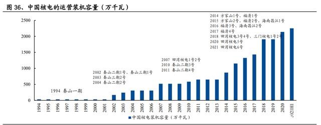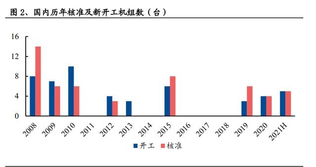 核電進入積極有序發展新階段,2021H 新開工 5 臺機組。2019 年,核電審批重啟 獲得官方確認。到 2025 年中國在運核電裝機達到 7000 萬千瓦, 在建核電裝機達到 3000 萬千瓦;到 2035 年在運和在建核電裝機容量合計將達到 2 億千瓦;核電建設有望按照每年 6 至 8 臺機組穩步推進。2021 年上半年,我國 已新開工 5 臺機組(包括昌江核電站 3 號機組,田灣核電站 7、8 號機組,徐大堡 核電站 3、4 號機組),積極有序發展的政策正在逐步兌現。