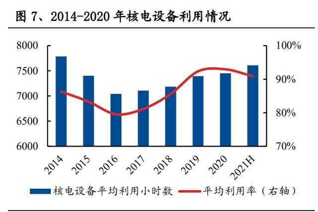 核電發電量 2021H 增速明顯回升,利用小時數延續提升趨勢。2020 年核電發電 量 3662.43 億千瓦時,同比增長 5.02%,增速放緩;2020 年核電平均利用小時數 達 7453 小時,同比繼續提升。2021 年上半年,核電發電量 1950.90 億千瓦時,同 比增長 13.70%,增速明顯回升;同時設備利用小時數達到 3805 小時(年化后為7610 小時),設備利用小時數自 2016 年以來持續提升。