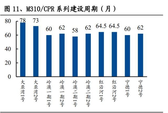 核電站的設計工期通常為 5 年,而實際建設周期約在 5-10 年。因缺乏施工經驗, 設計變更,耗時檢測等原因,中國核電機組普遍存在首堆拖期問題,導致建設期 利息費用增長、發電成本提高。而批量化生產有利于核電機組建設周期縮短、成 本下降。實現批量化建設之后,M310/CPR 等同機型系列建設周期可逐漸穩定在 5 年左右。