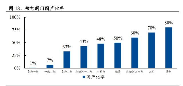 國產研發替代有利于降低核電建造成本。我國核電機組國產化程度逐步提高,以 核級閥門研發為例,核電閥門作為機組建設中使用數量較多的介質輸送控制設備, 目前已達到近 80%的國產化程度,而國產核級閥門價格僅為進口閥門的 11.5%。
