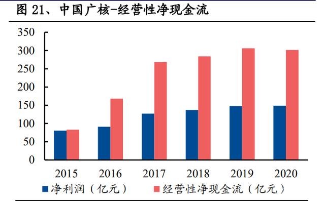 (4)現金流: 核電資產運營期可獲得穩健而充裕的經營性凈現金流。2020 年,中國核電的經營 性現金凈流入為 311.28 億元,是公司同期凈利潤的 2.84 倍;中國廣核的經營性現 金凈流入為 301.55 億元,是公司同期凈利潤的 2.03 倍。