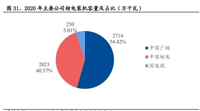 核電的開發運營具有行政準入壁壘、技術壁壘、資金壁壘,呈現高度集中的行業 特征。目前國內僅中核、中廣核、國電投、華能 4 家擁有核電運營牌照。截至 2020 年末,中廣核集團的裝機容量占比 54.42%,中國核電集團的裝機容量占比 40.56%, 此外國電投裝機容量占比 5.01%(按控股口徑)。