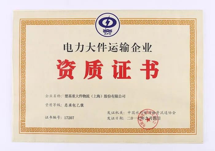 2017-2018年,榮獲電力大件運輸企業總承包乙級資質,第五屆理事會--理事單位,智慧物流專業委員會副會長單位,ISEA國際航運企業聯盟發起單位、會員單位,上海市企業誠信創建活動組委會誠信創建企業;榮獲中國貨運代理品牌50強。