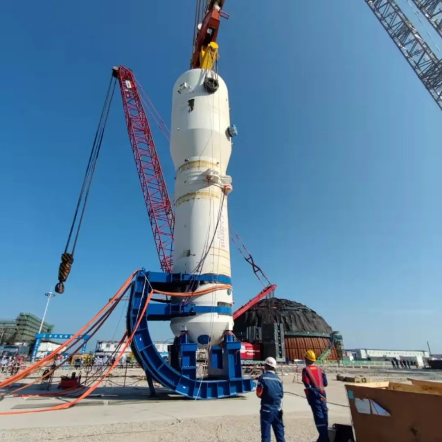 ZH-65型蒸汽發(fā)生器是華龍一號機組最核心的設(shè)備之一,是國內(nèi)首型具有完全自主知識產(chǎn)權(quán)的第三代核電蒸汽發(fā)生器。它的體積巨大,結(jié)構(gòu)復(fù)雜而精細,各項性能優(yōu)異,其設(shè)計和制造的高技術(shù)含量代表了中國高端制造業(yè)的前沿水平。本次施工采用新型翻轉(zhuǎn)裝置,該裝置利用重力和杠桿原理,無需特殊固定措施就能使主設(shè)備和翻轉(zhuǎn)支架形成一個整體,對比傳統(tǒng)的固定支架安裝調(diào)整以及安裝、拆卸抱環(huán)等工序,操作容易、安全性高,人因失誤概率低,極大提升了施工效率和安全。