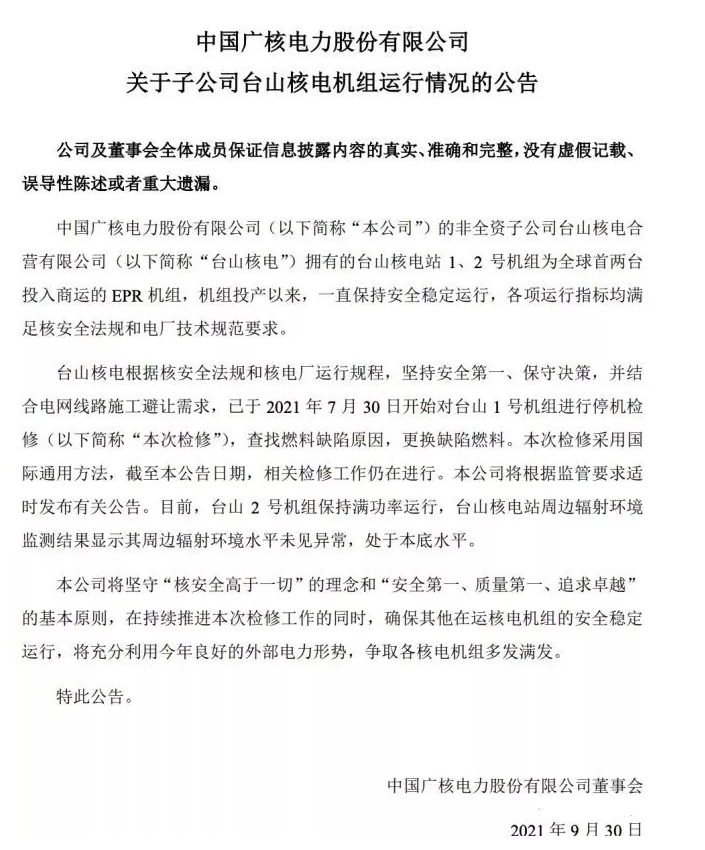 中國廣核10月7日發布公告稱:本公司的非全資子公司臺山核電根據核安全法規和核電廠運行規程,堅持安全第一、保守決策,并結合電網線路施工避讓需求,已于2021年7月30日開始對臺山1號機組進行停機檢修,查找燃料缺陷原因,更換缺陷燃料。本次檢修采用國際通用方法,截至本公告日期,相關檢修工作仍在進行。本公司將根據監管要求適時發布有關公告。目前,臺山2號機組保持滿功率運行,臺山核電站周邊輻射環境監測結果顯示其周邊輻射環境水平未見異常,處于本底水平。